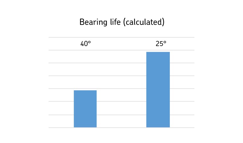 Tốc độ của các máy bơm chân không được phân tích cao hơn so với các máy nén trục vít có kích thước tương tự, trong khi tải lực đẩy thấp hơn một chút. Các phân tích cho thấy lựa chọn thiết kế tốt nhất là bố trí ổ trục kép kết hợp ổ trục SKF Explorer mới với góc tiếp xúc 25 ° và khe hở nhẹ. Kết quả tính toán được hiển thị trong biểu đồ dưới đây chứng minh rõ ràng sự khác biệt về hiệu suất khi nói đến tuổi thọ tính toán và giảm tổn thất điện năng.