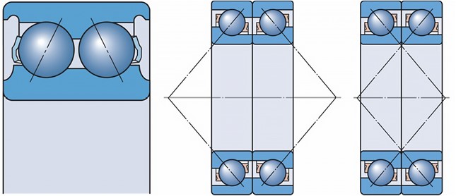 Vì lực dọc trục từ cả hai hướng xảy ra trong hầu hết các ứng dụng, nên các lực đối nghịch phải được hấp thụ bởi một ổ trục ngược. Dạng đơn giản nhất của ổ trục ghép nối là ổ bi tiếp xúc góc hàng đôi theo kiểu “O sắp xếp” cố định (theo hình dạng được phác thảo bởi các đường góc tiếp xúc). Vòng bi cầu tiếp xúc góc phổ thông, đơn lẻ cũng có thể được kết hợp theo nhiều cách khác nhau - theo cả cách sắp xếp O và X.