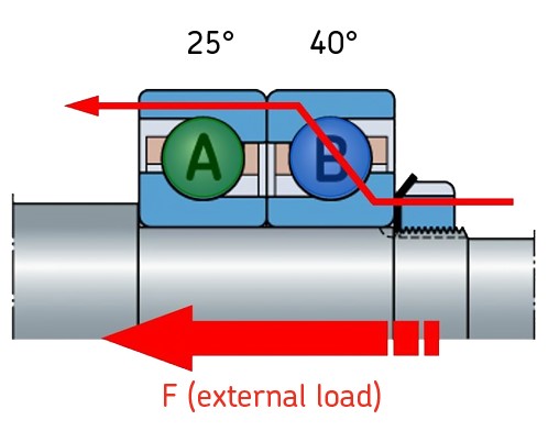 Các ưu điểm của bộ ổ trục không đối xứng liên quan đến sự phân bố tải trọng bên trong có thể được minh họa bằng cách sử dụng ví dụ về bộ ổ trục được tải trước bao gồm hai ổ bi tiếp xúc góc theo kiểu bố trí O, chịu một lực dọc trục thuần túy F (mũi tên màu đỏ). Vòng bi B với góc tiếp xúc 40 ° (hậu tố B) hấp thụ lực dọc trục, trong khi vòng bi A có góc tiếp xúc 25 ° (hậu tố AC) chịu lực dọc trục.