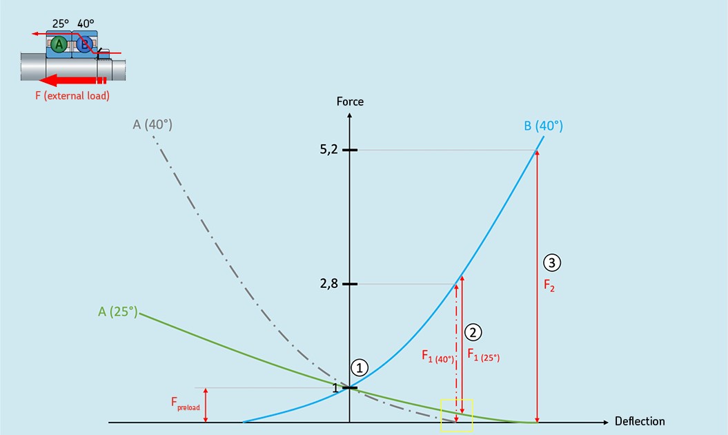 Hệ tọa độ biểu diễn độ võng trên trục x và lực trên trục y. Đường cong màu xanh lá cây cho thấy ổ trục A với góc tiếp xúc 25 ° và đường cong màu xanh cho thấy ổ trục B với góc tiếp xúc 40 °. Vị trí 1 đánh dấu tỷ lệ tải không có tải bên ngoài. Vị trí 2 thể hiện tỷ số tải trọng với lực dọc trục ngoài F1 ở mức lực nâng của gối đỡ 40 °. Vị trí 3 phản ánh tỷ số tải trọng với lực dọc trục ngoài F2 ở mức lực nâng của ổ trục 25 °.