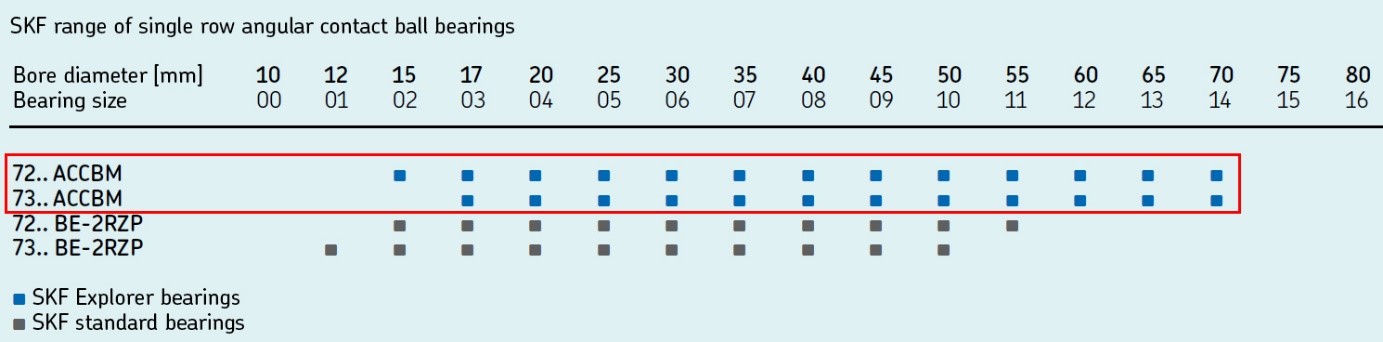 SKF gần đây đã tung ra một loạt các vòng bi tiếp xúc góc một dãy mở rộng với một vòng cách bằng đồng, có góc tiếp xúc nhỏ hơn 40 ° thông thường. Dưới đây là tổng quan về phạm vi vòng bi tiếp xúc góc 25 ° mới (hậu tố AC):
