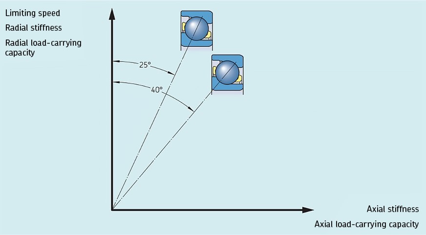 Góc tiếp xúc nhỏ hơn làm giảm khả năng chịu tải dọc trục một chút, nhưng điều này tạo ra những lợi thế khác. Ví dụ, trong các điều kiện nhất định, có thể đạt được tốc độ cao hơn tới 20% so với góc tiếp xúc 40 °. Điều này được hỗ trợ bởi các điều kiện động học thuận lợi hơn trong ổ trục, giúp giảm thiểu thành phần trượt và do đó tạo ra ít nhiệt hơn. Ngoài ra, góc tiếp xúc nhỏ hơn đảm bảo độ cứng hướng tâm lớn hơn, điều này có lợi trong các ứng dụng có tải trọng hướng tâm là chủ yếu.
