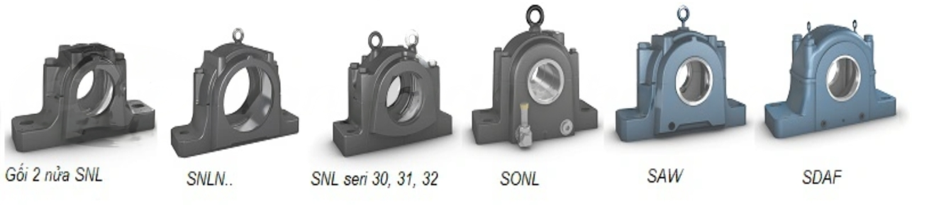 Gối 2 nửa SNL: Bộ gối SNL của SKF là loại phổ biến nhất trên thị trường là lựa chọn số 1 cho chất lượng và kinh tế. Vở gối giảm chấn cho phép vòng bi họat động với tuổi thọ lâu nhất và ít bảo trì nhất. Bộ gối SNL được thiết kế nhiều biến thể và phớt làm kín khác nhau.