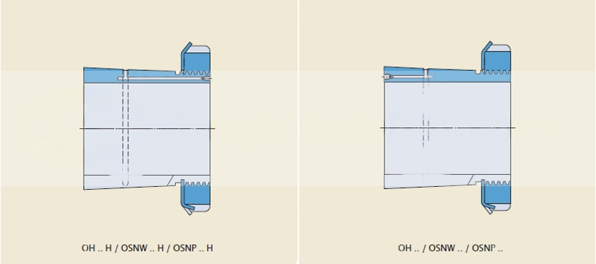 Đối với các cỡ lớn hơn (đường kính lỗ ≥ 1 060 mm) và các biến thể không kê trong bảng thông số kỹ thụât, xin liên hệ SKF. Các kiểu thiết kế để sử dụng với bơm dầu. Ống lót côn rút có đường bơm dầu và các rãnh phân phối dầu để sử dụng phương pháp bơm dầu thủy lực để tháo và lắp ổ lăn (các ống lót thuộc dãy OH, OSNW và OSNP).