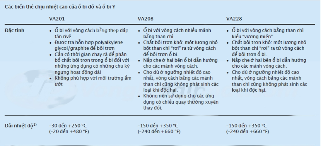 Mỗi ứng dụng ở nhiệt độ cao đều có những đòi hỏi khác nhau. Trên thực tế, SKF đã phát triển một số kiểu thiết kế biến thể để mang lại hiệu quả cao nhất tùy theo các điều kiện làm việc của mỗi ứng dụng. Các thiết kế biến thể tiêu biểu đựoc cho trong bằng dưới: